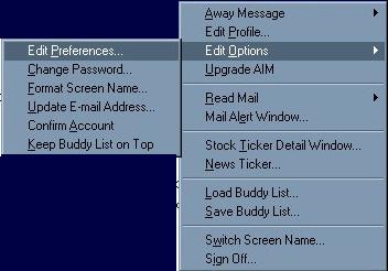 Buddy Icon Now, the 'Buddy Icon' tab. This isn't really needed, but it is cool. You can select your own icon that will be shown in the IM windows of all the people you chat with. It allows you to personalize AIM just a bit to suit your own personality. Just click 'My Buddy Icon' to set your own. AIM comes with tons of icons, or you can find literally millions on the web to suit your own taste. Away Status The 'Away' tab is one of the best features. From here you can set custom Away messages to display to others who message you when you're away. To create one, just click 'Add Message' and enter a name for it and text. To set yourself as Away, click on 'My AIM' then 'Away'. If you have more than one Away message, a list will display for you to choose. Select one, and you're away. While away AIM will log your messages for you when you return. To return, just click 'I'm Back'. In the box you will see your messages, double click them to read. Sounds If you go into the preferences menu and select the sounds tab, you can change the sounds you hear when buddies come online, go offline, and send/recieve message sounds. These can be changed to almost any WAV compatible file. Multi-User Buddy Chat To start a Multi-User Buddy chat is really pretty easy. The buddy chat is sorta like an IRC room, only it's more of an invitation only sorta deal. First thing you'll want to do is click on People. From there click the option for Send Buddy Chat Invitation. From there just add the buddies screen names and the room name and send it. If your buddies are free to chat they'll join your room and interact. There are no real channel operators and such in this buddy chat room, so you can't really moderate it like an IRC room Next >> |