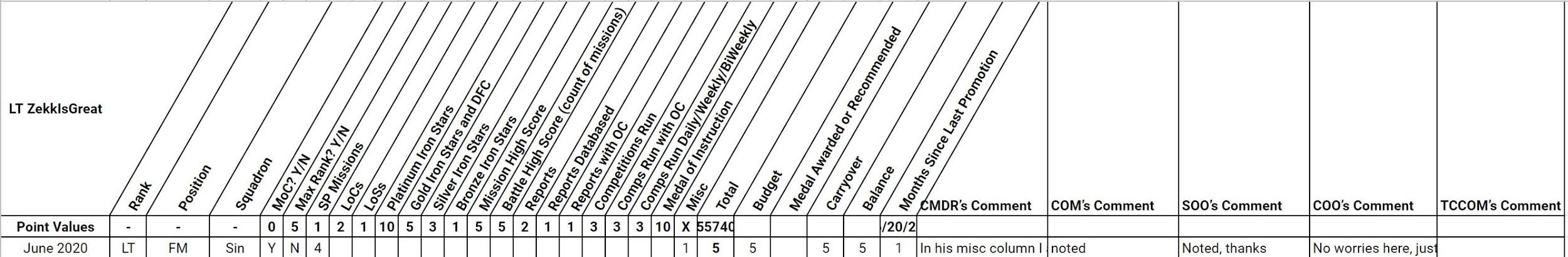 Zekk turned off his holographic projector, and the lights in the auditorium came up. He leaned forward over the podium. "Now, ladies and gentlemen and aliens, we come to the less fun part of the job--filling out your paperwork and managing your squadron on a day-to-day basis. We are Imperials, as you know, and bureaucracy is important to us. For this we present none other than the master of tedium, General Gilbert H. Frown, as a guest lecturer!" Zekk stepped to the side and began to applaud. There was very muted applause from the audience for General Frown as a hush fell over the crowd; General Frown was well-known in the TIE Corps. He is the only person to have risen from the rank of Sub-Lieutenant all the way to General due entirely to his proficiency with filling out paperwork in triplicate. He had never flown a combat tour. Rumor has it he piloted a tug to pick up a cargo container. Once. General Frown lived up to his namesake. He scowled at the young, impressionable pilots with derision. What did they know? They had never filled out a form in their lives. They didn't know the sacrifices he made in paperwork to keep the TIE Corps running efficiently. He put his hands out, palms down. "Alright alright, relax. Everyone sit down," he said. No one was standing. He turned to Terrik. "Colonel, get me a glass of room temperature tap water, if you would." Zekk sighed and nodded. "Yes, sir," said Zekk, and began to trudge the other way. General Frown turned to the crowd. "Now, if you will open your books to page 121, we will discuss how to assist your pilots in enrolling in the TIE Corps' 401(k) and dental insurance plans...." said General Frown, in a dry tone of voice. The crowd visibly slumped in their seats with many audible groans. 1. Completing your MSE spreadsheet The spreadsheet helps CMDRs determine which pilots should receive a Merit Award and which Merit Award they should receive. Certain activities, such as flying missions, uploading uniforms, or setting highscores, earn a certain number of points, and points are used to determine awards. We will use the example below during this lesson. Let's imagine we are updating the MSE spreadsheet for July 2020. The first step is to create a new row for the new month for each pilot. Simply copy an entire row, formulas and all, and paste it to the next line below June 2020. Do this for each sheet (e.g. each pilot) in the spreadsheet. The columns are labeled at the top. The first inputs should be obvious--you will fill out the month and year, the pilot's rank, position, and their squadron. Next up, do you believe this pilot earned a Medal of Communication (or MoC)? This is entirely up to you. The definition of the MoC is for "contributions to Fleet communications." I generally set a pretty low bar for the medal as I feel this engages your pilots, but it is up to you. Generally, I will only not award one if I don't see or hear from them at all--either in the Discord or on the email group. Is your pilot at maximum rank? This information can be found in the TIE Corps Pilot Manual. The maximum rank for Flight Members is Major, for Flight Leaders it's Colonel, and for Squadron Commanders it's General. If they are at max rank, this adds five points as an incentive. The next columns address your pilot's flying activity--flying single player missions in TIE Fighter, X-wing vs TIE Fighter, and X-wing Alliance, as well as any Legions of Combat or Skirmish they earned playing any of these, or Star Conflict as well. To enter the appropriate data in each cell, you will need to check your pilots' activity. Go to TIE Corps webpage and open up your squadron roster, the Kill Board, the Multiplayer Kill Board, and the Multiplayer Coop Kill Board in separate tabs. Make sure they are set to display the correct month. Keep those four tabs open as you do your MSE. On each page, open up the search function in your browser and search for your pilot's name. The Kill Board is for SP missions, the Multiplayer Kill Board is for Legions of Combat, and the Multiplayer Coop Kill Board is for Legions of Skirmish. Simply search for your pilot's name, and enter however many legions or single player missions flown in the appropriate column. The next area is competition participation. This can get a bit tricky but it all boils to keeping track of your pilots and encouraging them to communicate with you. The TIE Corps Commander shares a spreadsheet with all the CMDRs indicating which fleet wide competitions pilots participated in, however this will not be all-encompassing. Another officer may be running a fleet wide competition. This is where you must encourage your pilots to communicate with you so they can receive credit for their participation. Don't hesitate to ask for proof of participation or contact the person running the competition. You are not a mind reader! It is also helpful to log this information in your Google Drive records. Here you will also notate which squadron competitions your own pilots participated in. Please note that even if you run a weekly competition (like trivia for instance) it only counts ONCE per month on their MSE. You will also do this for the next part--highscores earned. Simply search for the word "highscore" and enter how many SP highscores your pilot obtained that month. The next part, from reports to comps run daily/weekly/biweekly, is mostly for Squadron Commanders, although it is not uncommon for Flight Leaders to submit reports as well, and is in fact encouraged. You will enter how many reports you did during that month. When you are a commander you will also have the option to upload reports in the TIE Corps database--this makes it automatically generate on the TIE Corps news site as well, which makes it easy to find for your pilots. You want to make sure you always database your reports. A lot of Squadron Commanders like to also include art or a bit of fiction with their reports. This is what the column labeled "Reports with OC" (origina